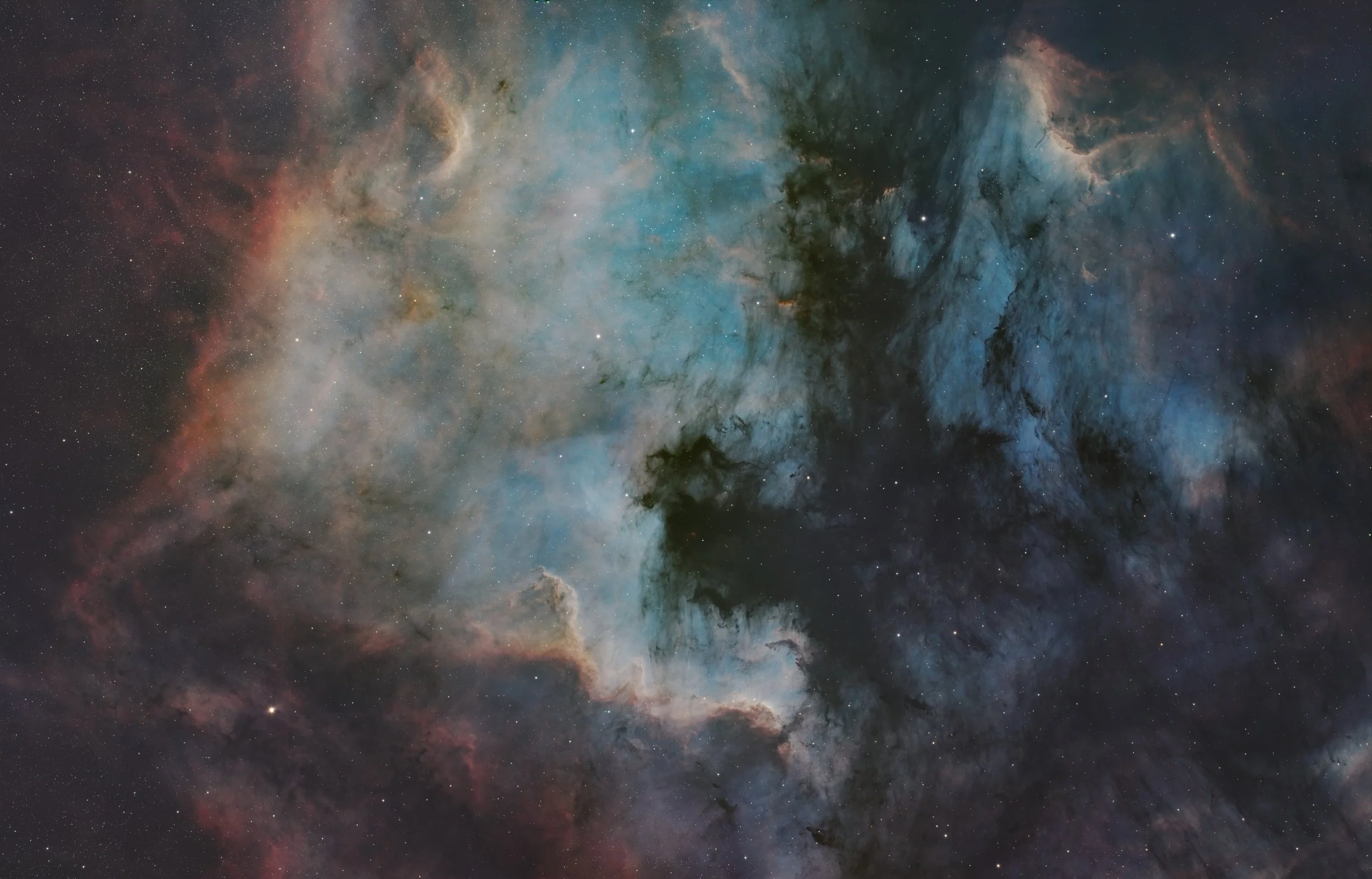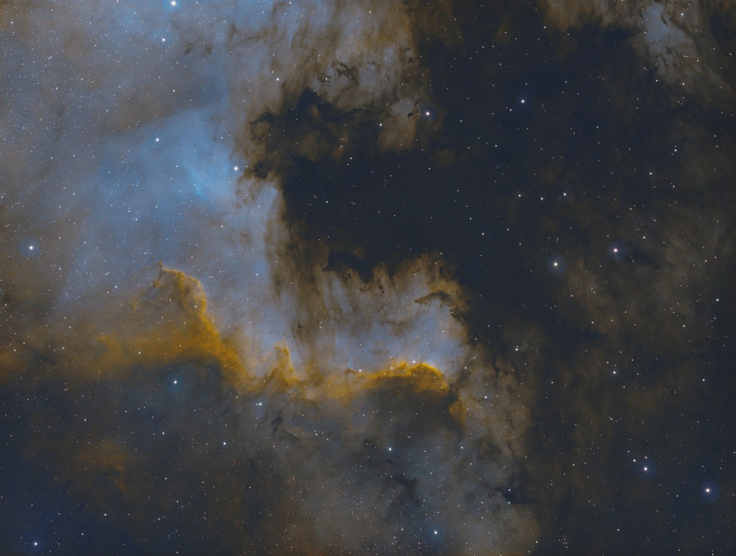 NGC 7000 - North America Nebula revisited with image processing using PixInsight. The workflow I followed had issues with the SII bands so the reds did not come through. I’ll give it another shot in the future. Interesting to see the halos which might be the filters or possibly bad calibration frames.